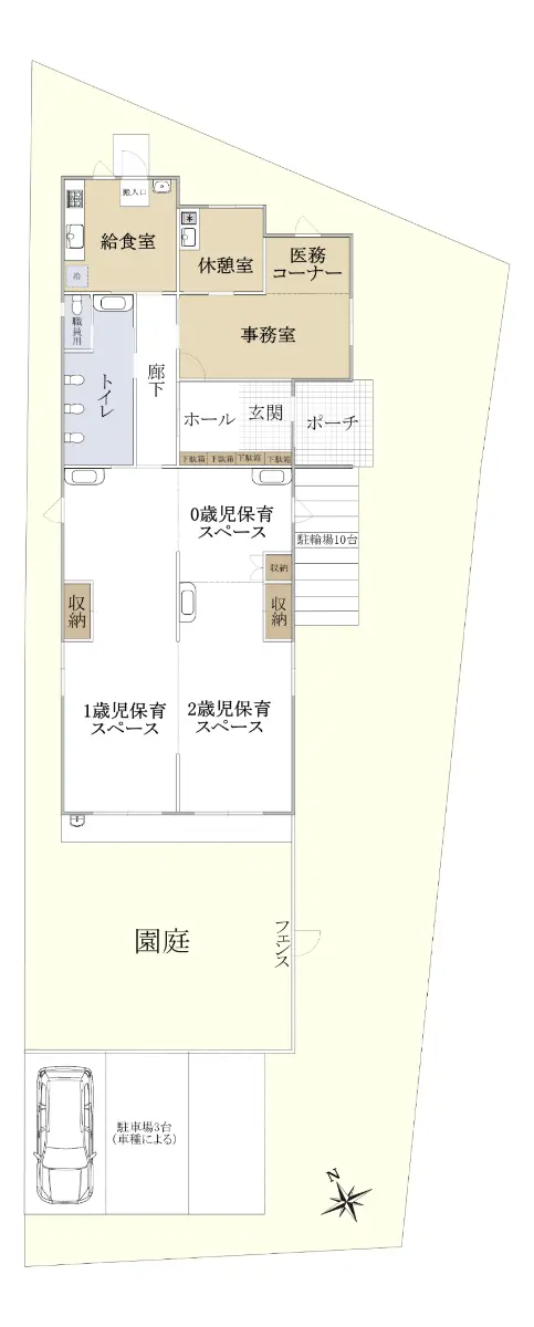 建物は在来木軸工法による木造平屋建てで、延べ面積は149.88uとなっております。現在、保育所を建築しており2