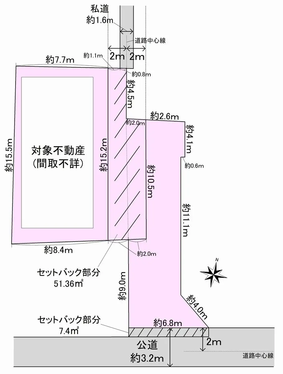 | 接道状況 | 二方道路・南3.2m(公道)接面6.8m/北1.6m(私道)接面0.8m |
