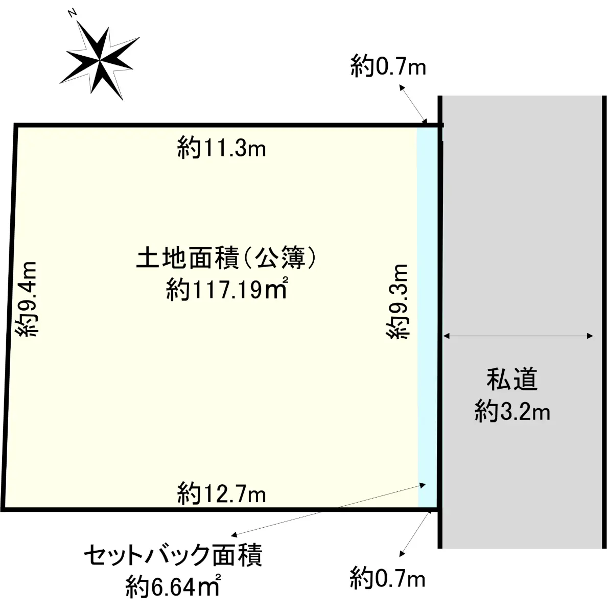 | 接道状況 | 一方道路・南東3.2m(私道)接面9.3m |