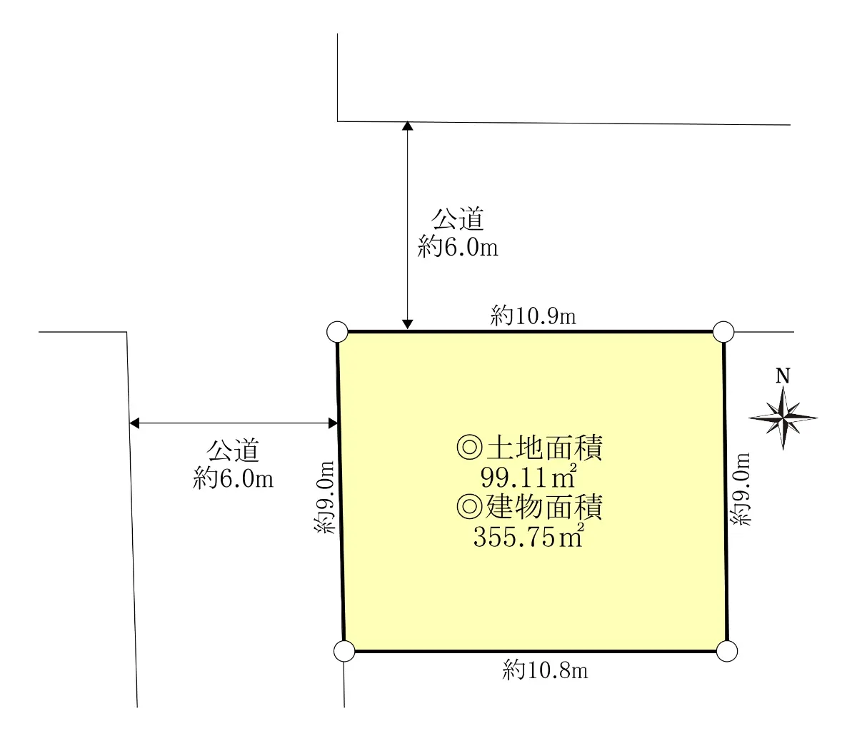 | 接道状況 | 角地・北6m(公道)接面10.9m/西6m(公道)接面9m |