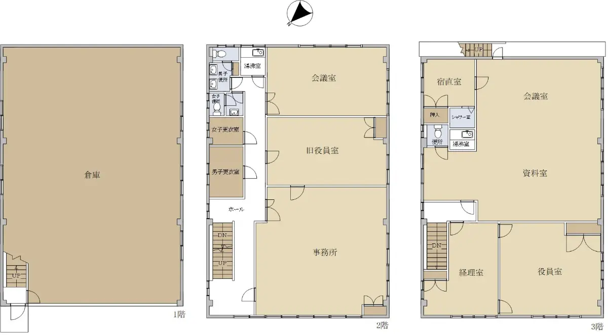 1階はフロア前面が倉庫、2、3階が事務所となっている物件です。