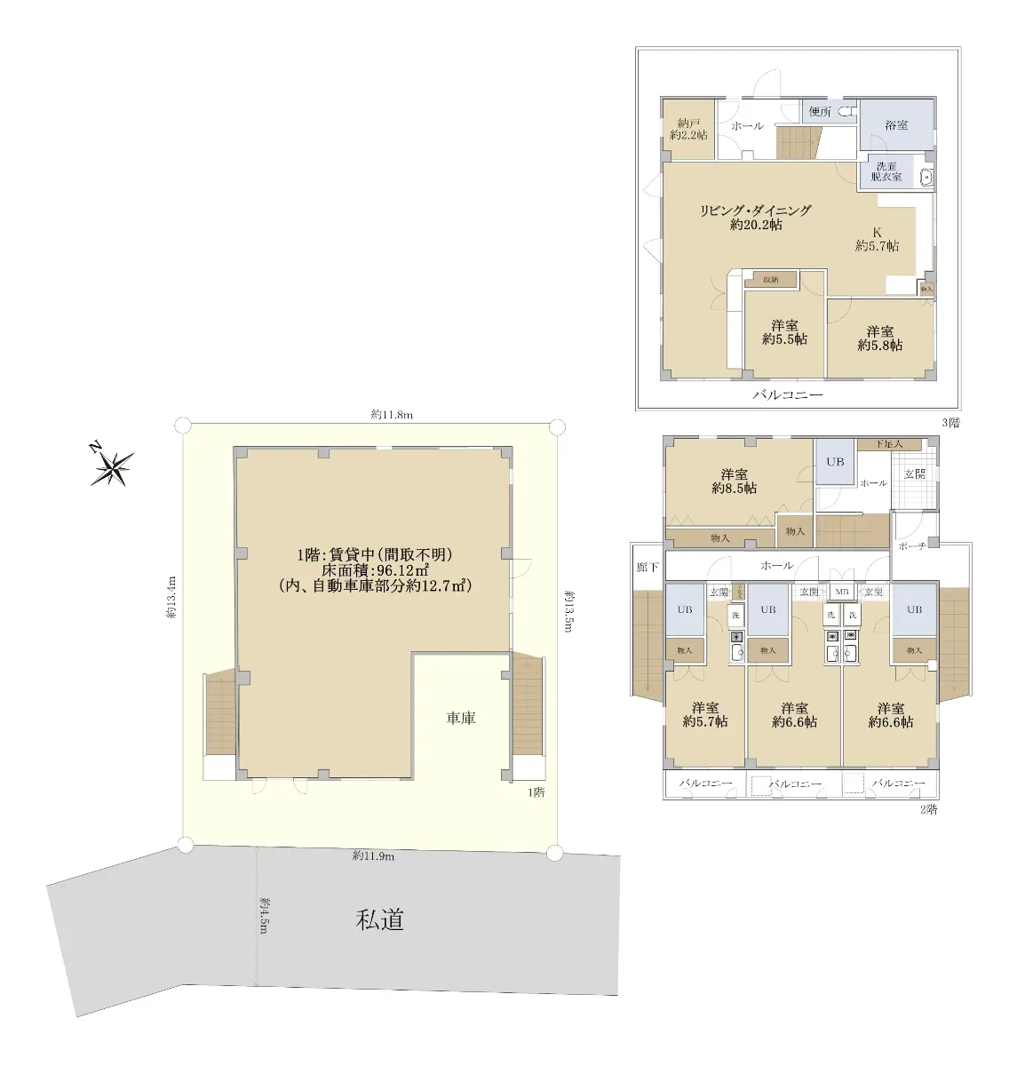 | 接道状況 | 一方道路・南4.5m(私道)接面11.9m |