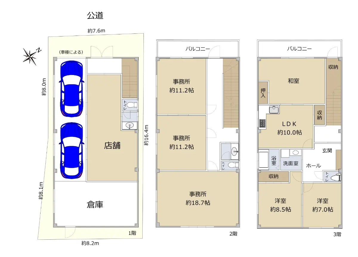 ◇1階:車庫(2台分)、店舗、倉庫