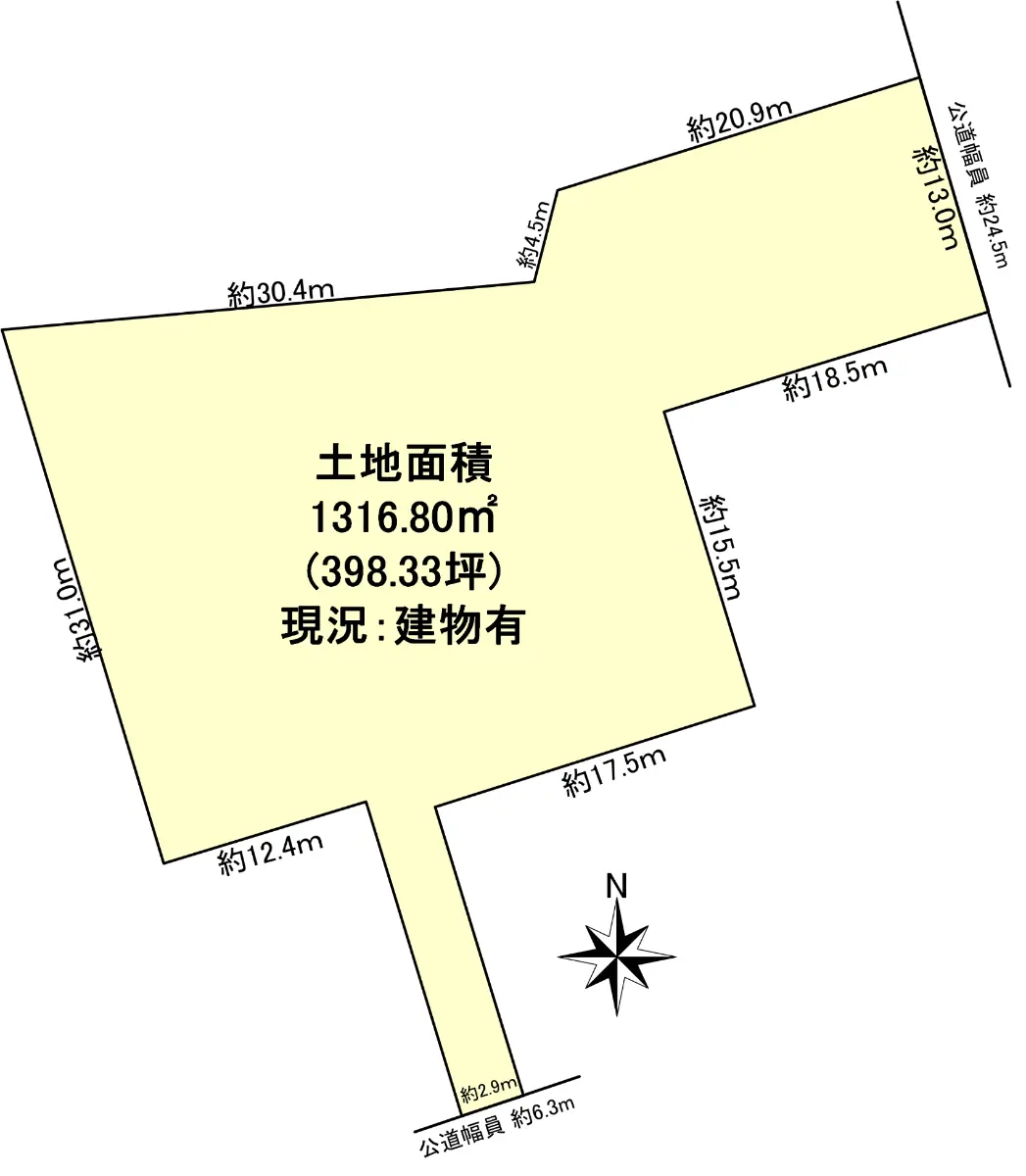| 接道状況 | 二方道路・北東24.5m(公道)接面13m/南東6.3m(公道)接面2.9m |