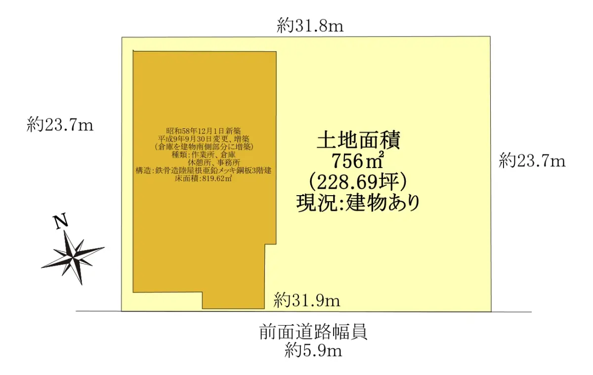 本物件上の建物情報:@種類:作業所、倉庫、休憩所、事務所A構造:鉄骨造陸屋根亜鉛メッキ鋼板葺3階建B床面積1階