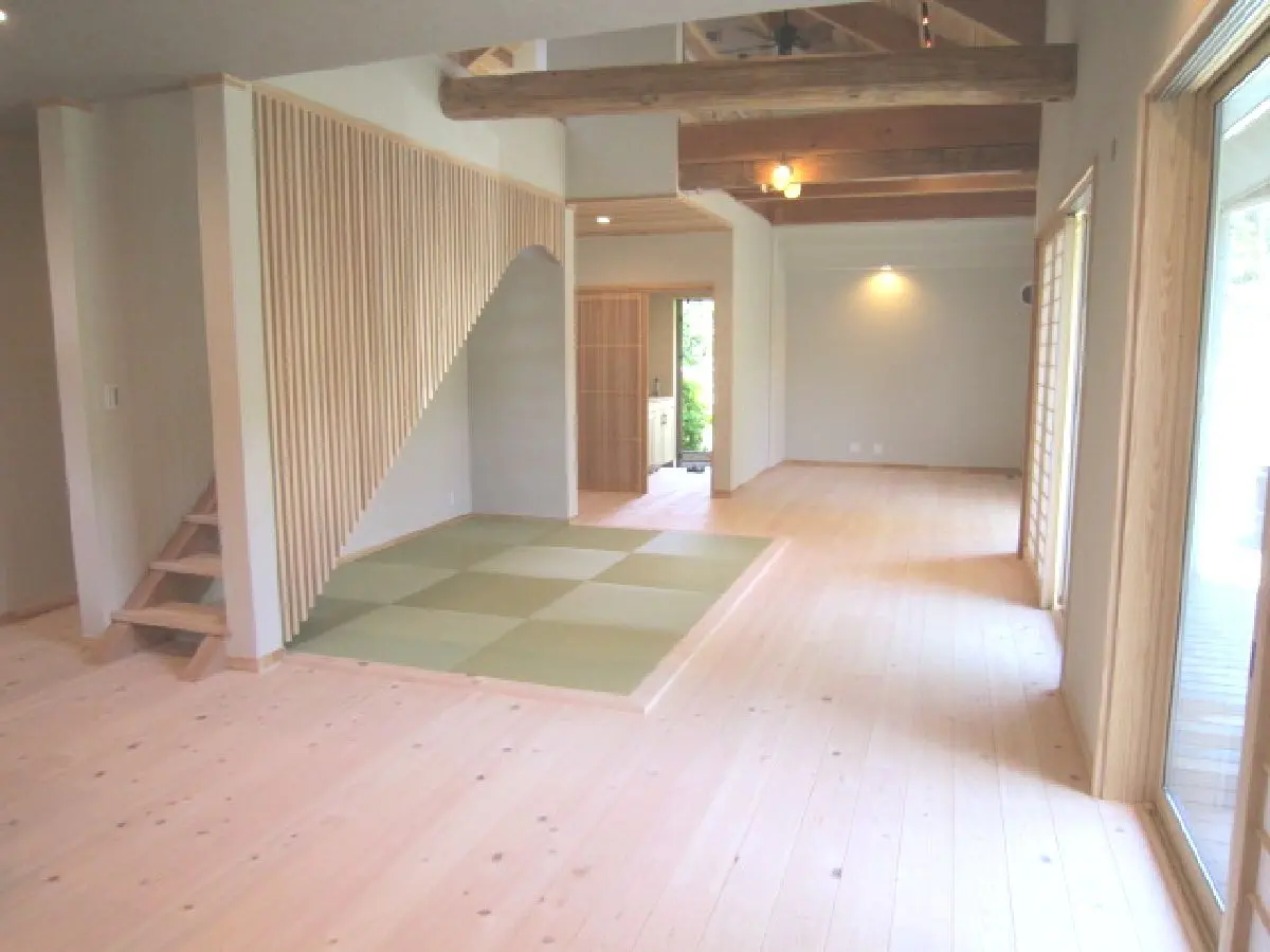 本物件の特徴はなんといっても天井吹き抜けの、開放感あふれるリビングでございます。平屋戸建をリノベーションした本物件ならではの、通常の戸建では味わうことのできない魅力的なポイントでございます。また中央には琉球畳の畳コーナーを設置しております。無垢材に包まれたリビングの中にワンポイントとして、見た目にも機能にもアクセントを加えます。