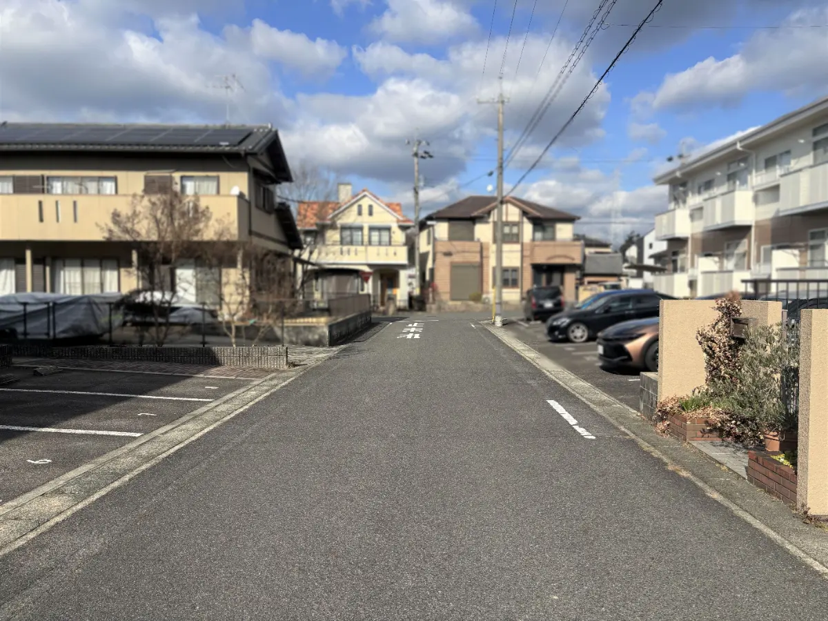 前面道路の幅員は約6.1mあり、駐車もしやすいです。