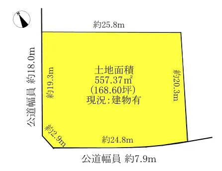 | 接道状況 | 角地・北西18m(公道)接面19.3m/南西7.9m(公道)接面24.8m |