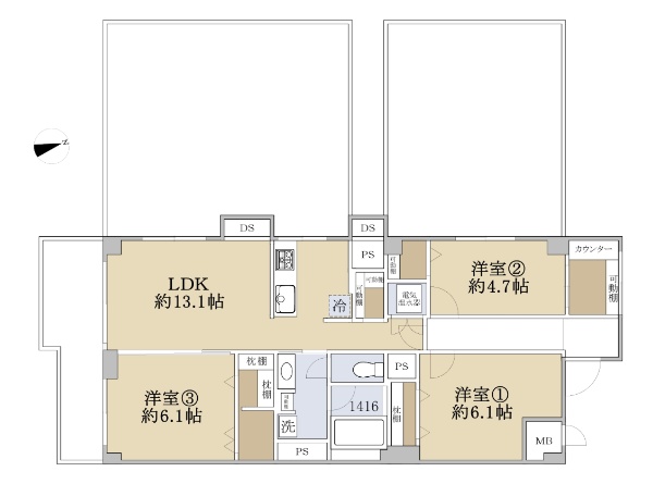 バルコニーから海が見える専有面積70.86uの3LDK