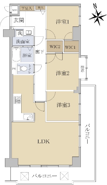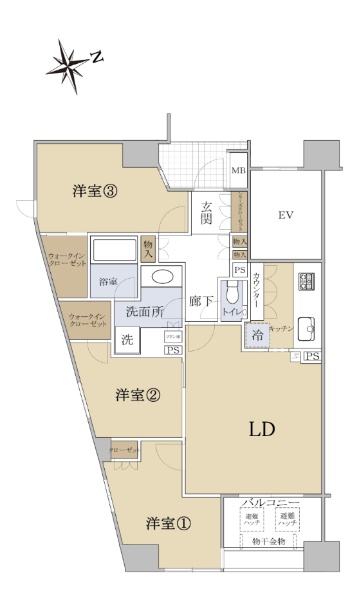 専有面積65.16u 三方向(南・東・西)角部屋 日照・通風良好