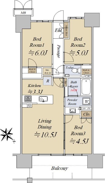 【現在空室】☆南向きバルコニーを配した陽当たり良好な3LDK ☆WIC付