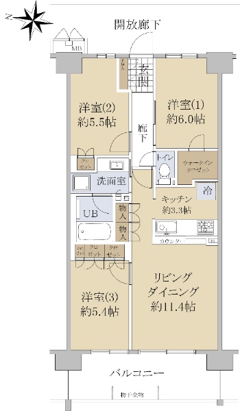 専有面積66.73uの3LDK、東・北・西の3方角部屋