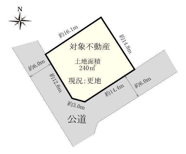 南東側約6.0m公道、南西側約6.0m公道の角地、陽当り良好。