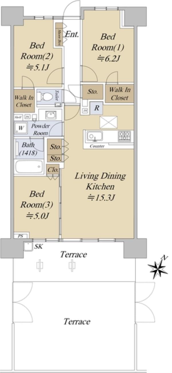 | 間取内訳 | 洋室6.2畳 洋室5.0畳 洋室5.1畳 LDK15.3畳 | ||