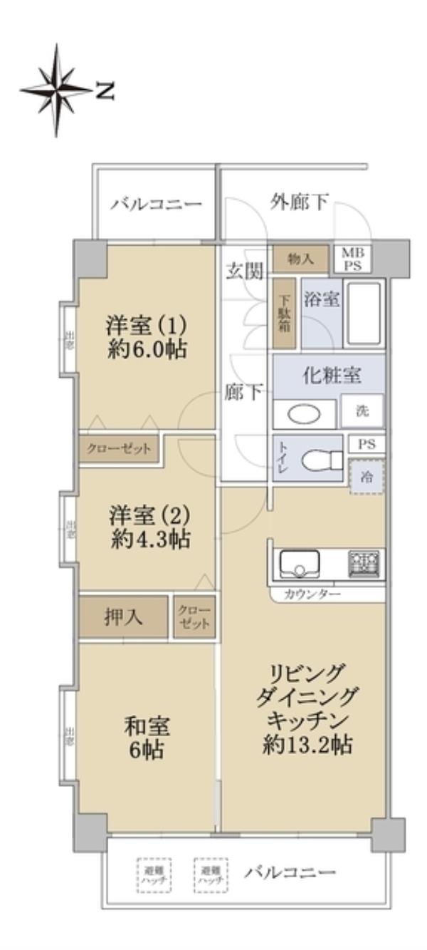 | 間取内訳 | LDK13.2畳 洋室6.0畳 洋室4.3畳 和室6.0畳 | ||