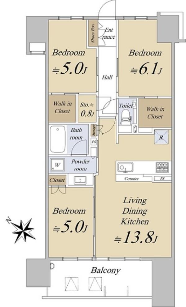 | 間取内訳 | LDK13.8畳 洋室5.0畳 洋室5.0畳 洋室6.1畳 | ||