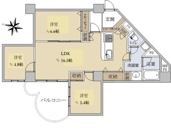 | 間取内訳 | LDK16.5畳 洋室6.6畳 洋室5.4畳 和室4.8畳 | ||