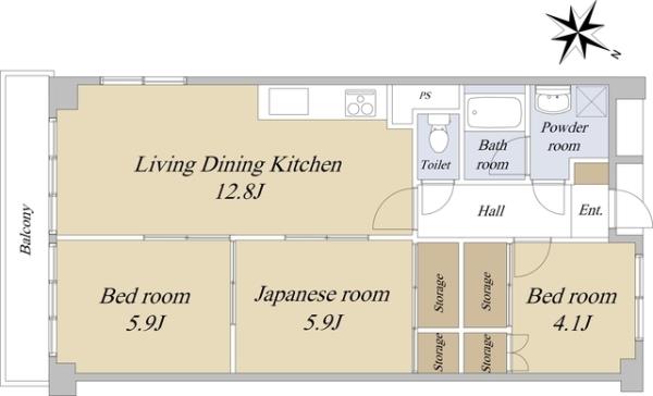 | 間取内訳 | LDK12.8畳 洋室5.9畳 洋室4.1畳 和室5.9畳 | ||