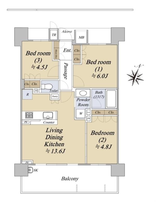 | 間取内訳 | LDK13.6畳 洋室6.0畳 洋室4.8畳 洋室4.5畳 | ||