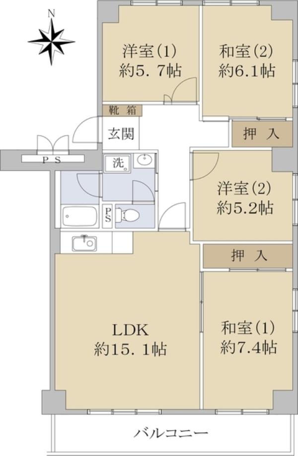 | 間取内訳 | LDK15.1畳 洋室5.7畳 洋室5.2畳 和室7.4畳 和室6.1畳 | ||