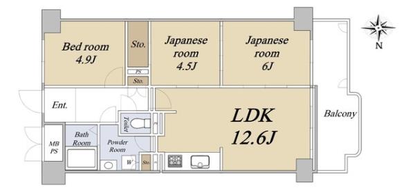 | 間取内訳 | LDK12.6畳 洋室4.9畳 和室6.0畳 和室4.5畳 | ||