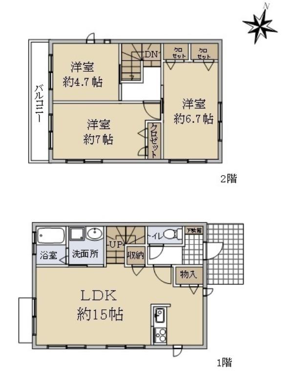 | 間取内訳 | 1階 LDK15.0畳 2階 洋室7.0畳 2階 洋室6.7畳 2階 洋室4.7畳 | ||