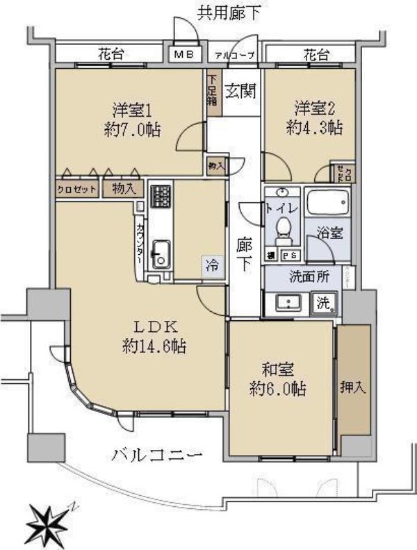 | 間取内訳 | LDK14.6畳 洋室7.0畳 洋室4.3畳 和室6.0畳 | ||