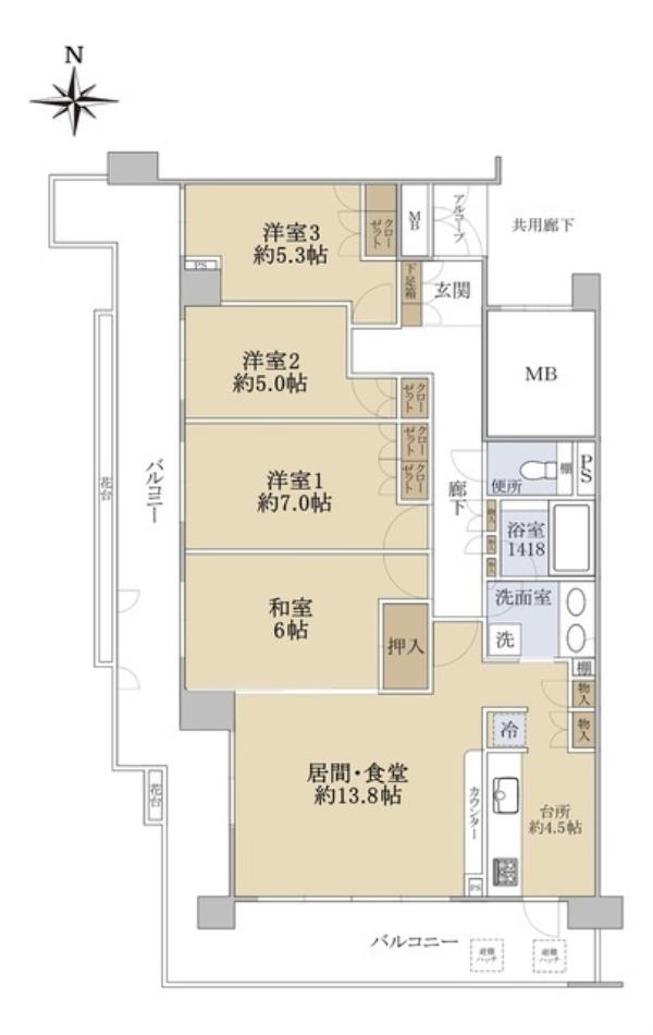 | 間取内訳 | LDK18.3畳 洋室7.0畳 洋室5.3畳 洋室5.0畳 和室6.0畳 | ||