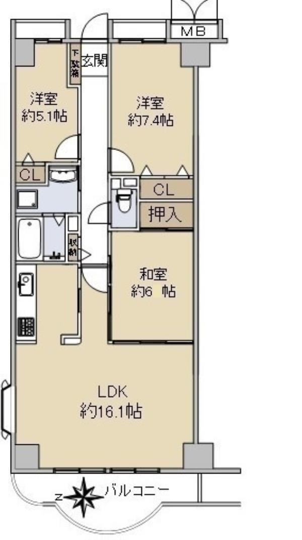 | 間取内訳 | 洋室7.4畳 洋室5.1畳 和室6.0畳 LDK16.1畳 | ||