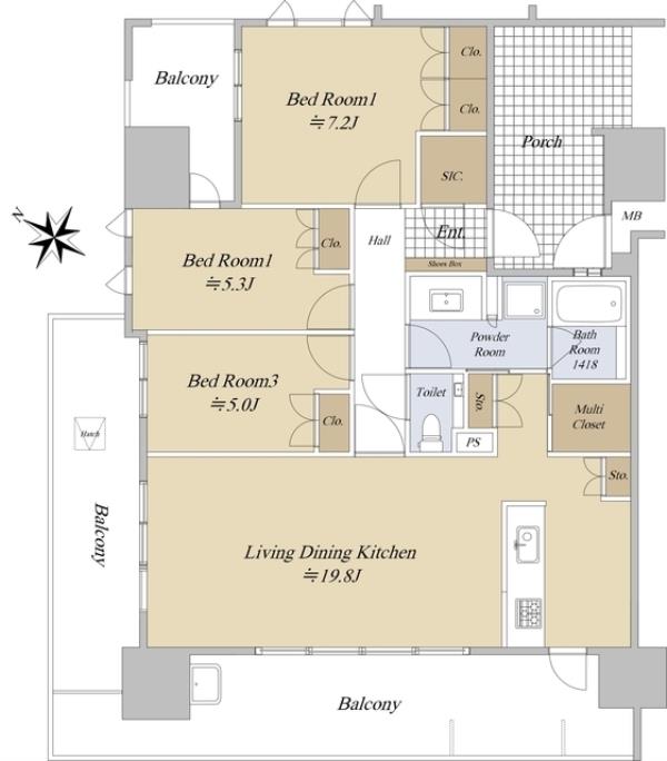 | 間取内訳 | LDK19.8畳 洋室7.2畳 洋室5.3畳 洋室5.0畳 | ||