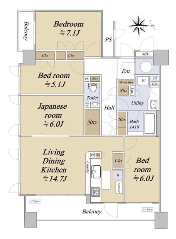 | 間取内訳 | LDK14.7畳 洋室6.0畳 洋室7.1畳 洋室5.1畳 和室6.0畳 | ||