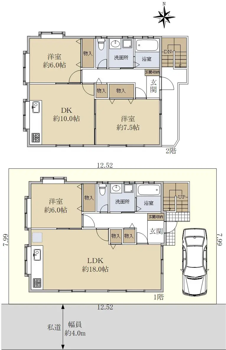 | 接道状況 | 一方道路・南4m(私道)接面12.5m |
