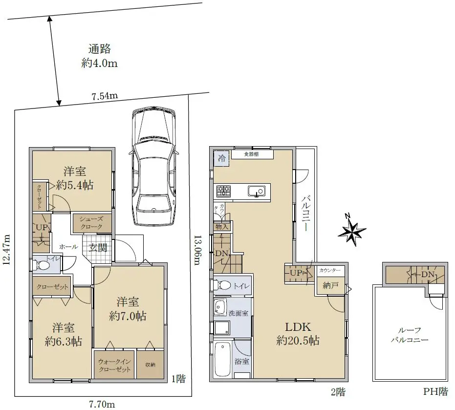 LDK約20.5帖 3LDKの新築一戸建て ルーフバルコニー付き 整形地