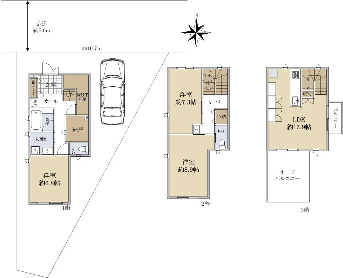 □建物面積:105.98u 1階:39.25u 2階:39.25u 3階:27.48u