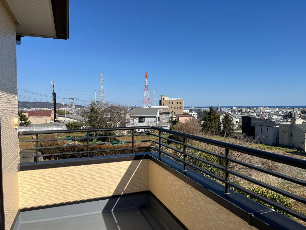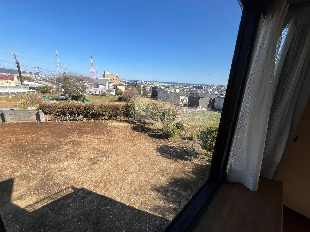 海を見渡す眺望です。見晴らしの良い丘の上の戸建 お庭も広々ございます。