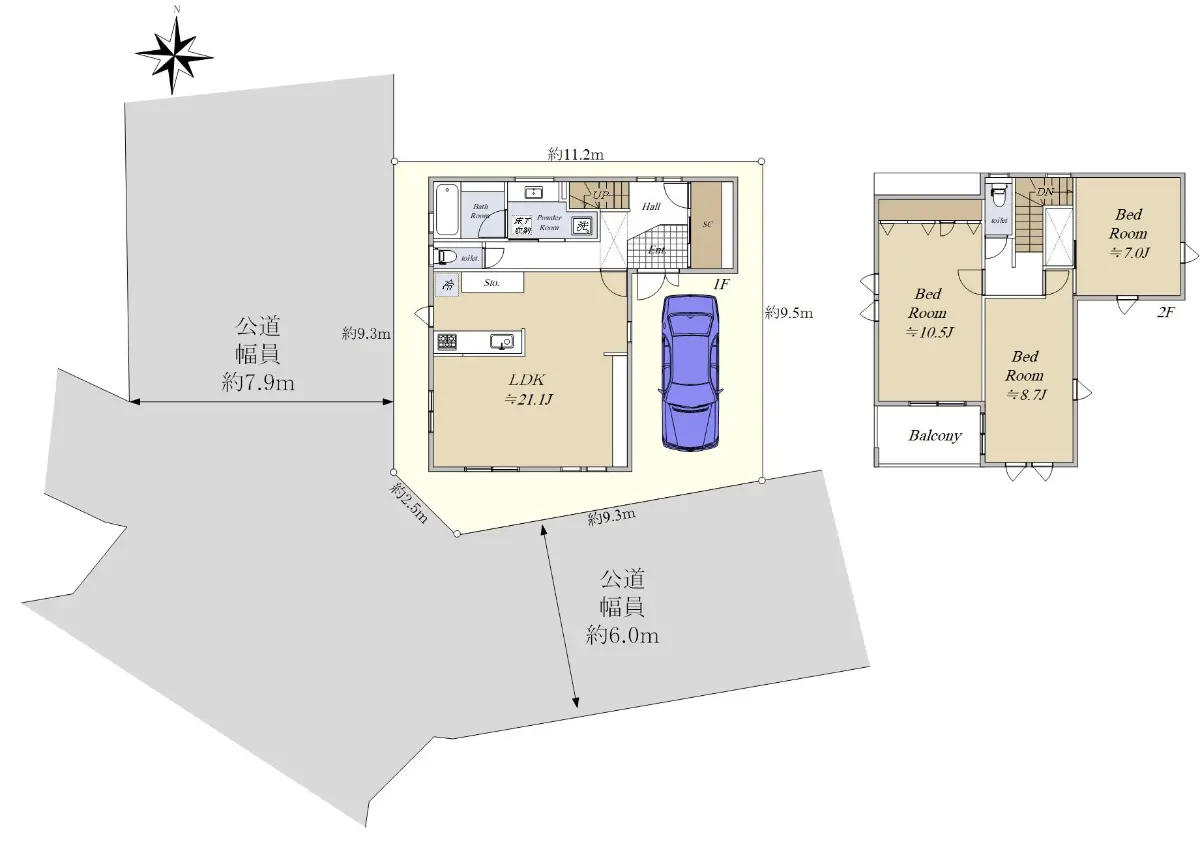 | 接道状況 | 角地・南6m(公道)接面9.3m/西7.9m(公道)接面9.3m |