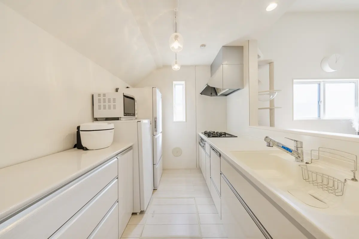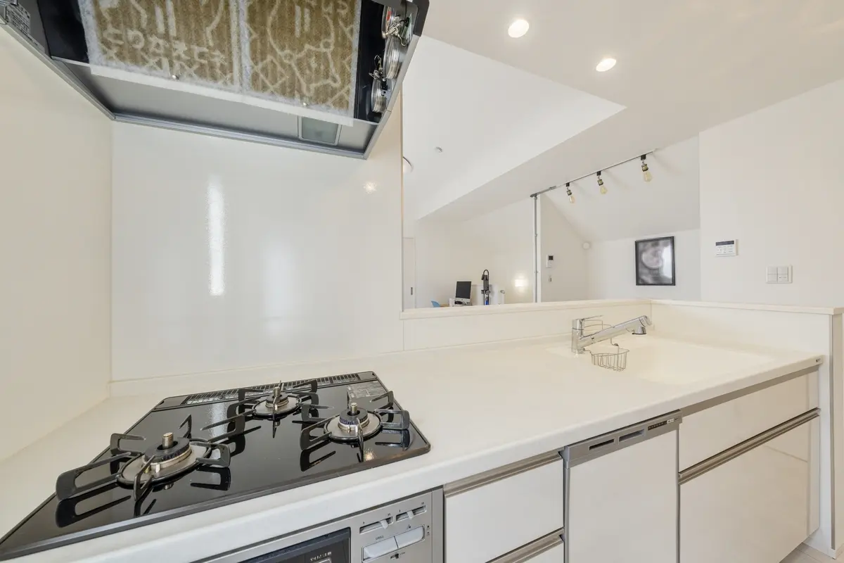 リビングダイニングを見渡せるカウンターキッチンの為、料理をしながらお子様の様子も確認でき、