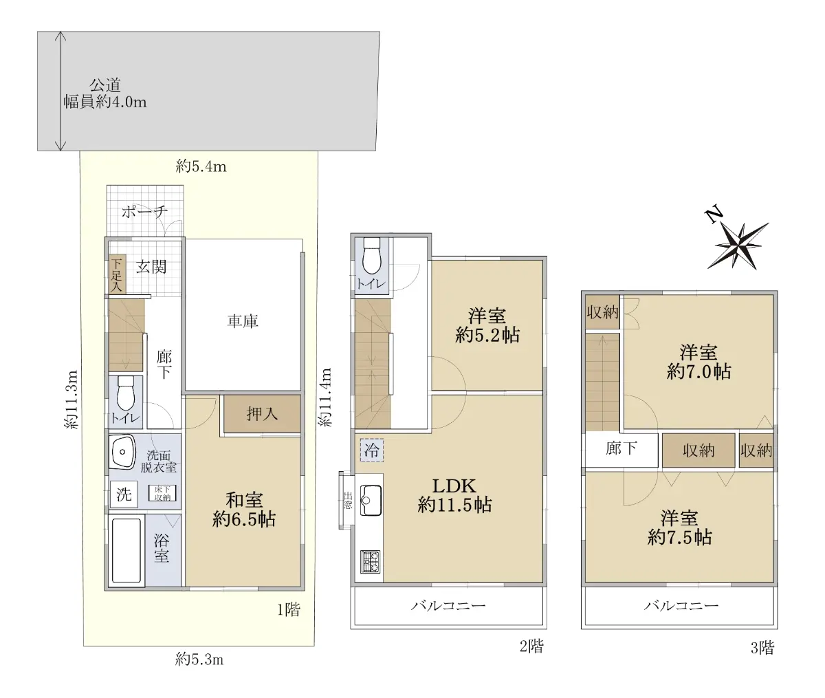 | 接道状況 | 一方道路・北東4m(公道)接面5.4m |