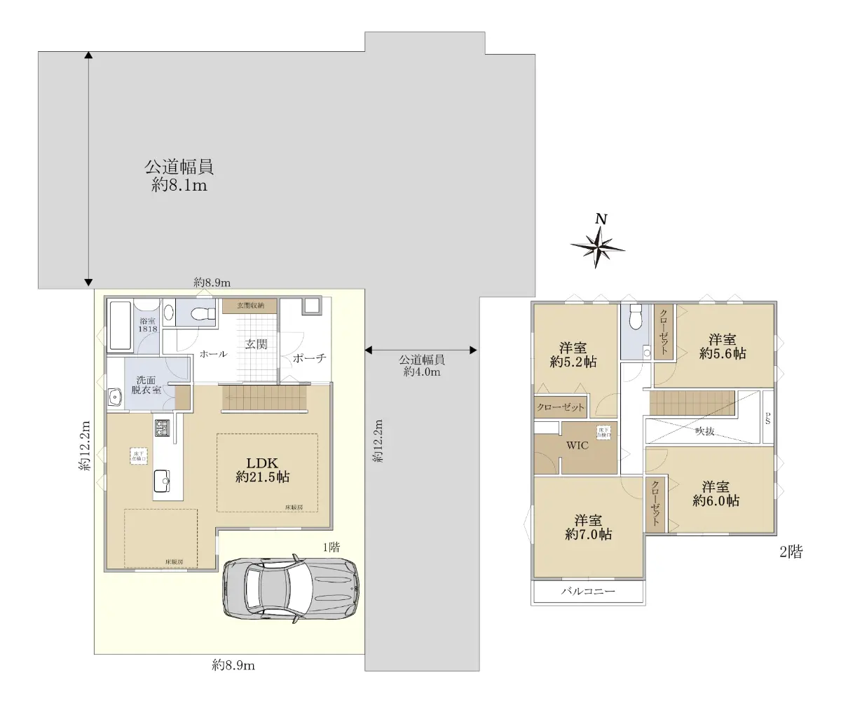 | 接道状況 | 角地・北8.1m(公道)接面8.9m/東4m(公道)接面12.2m |