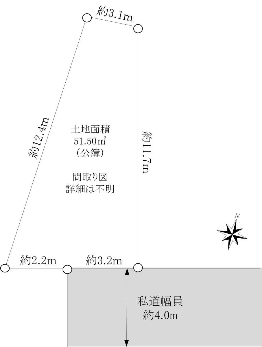 | 土地面積 | 51.50m2(約15.57坪)※公簿/他に私道負担:17.36m2あり |