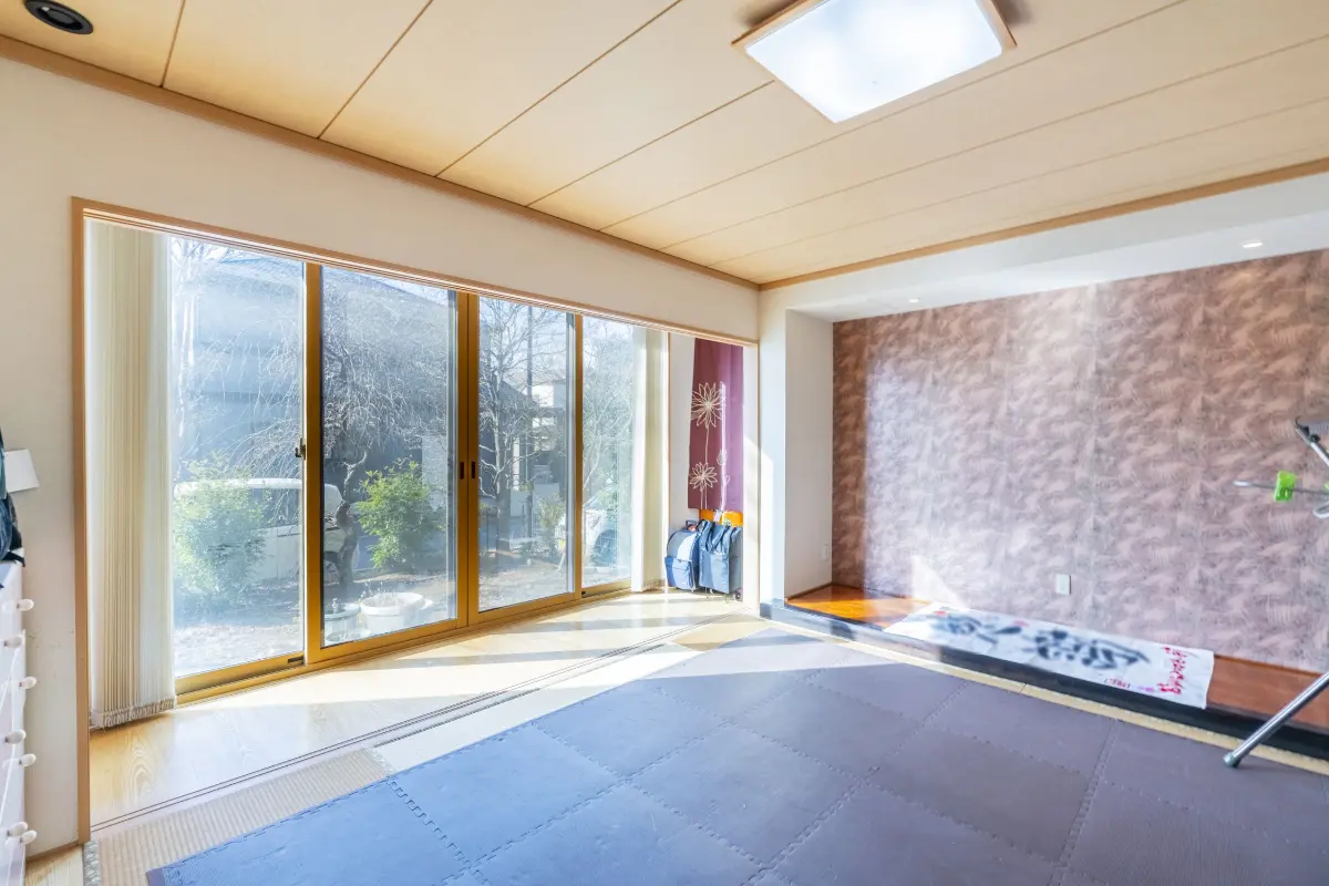 1階和室には電動シャッターを採用しており、外部からの視線を防ぎ防犯性にも優れています。広縁も設けられており、窓から差し込む直射日光を遮る効果に加え、空気の層ができることで外気温の影響を受けにくくなります。