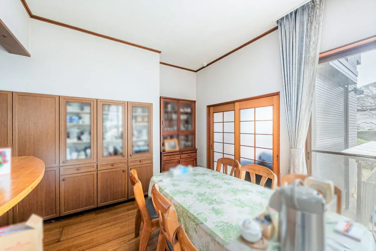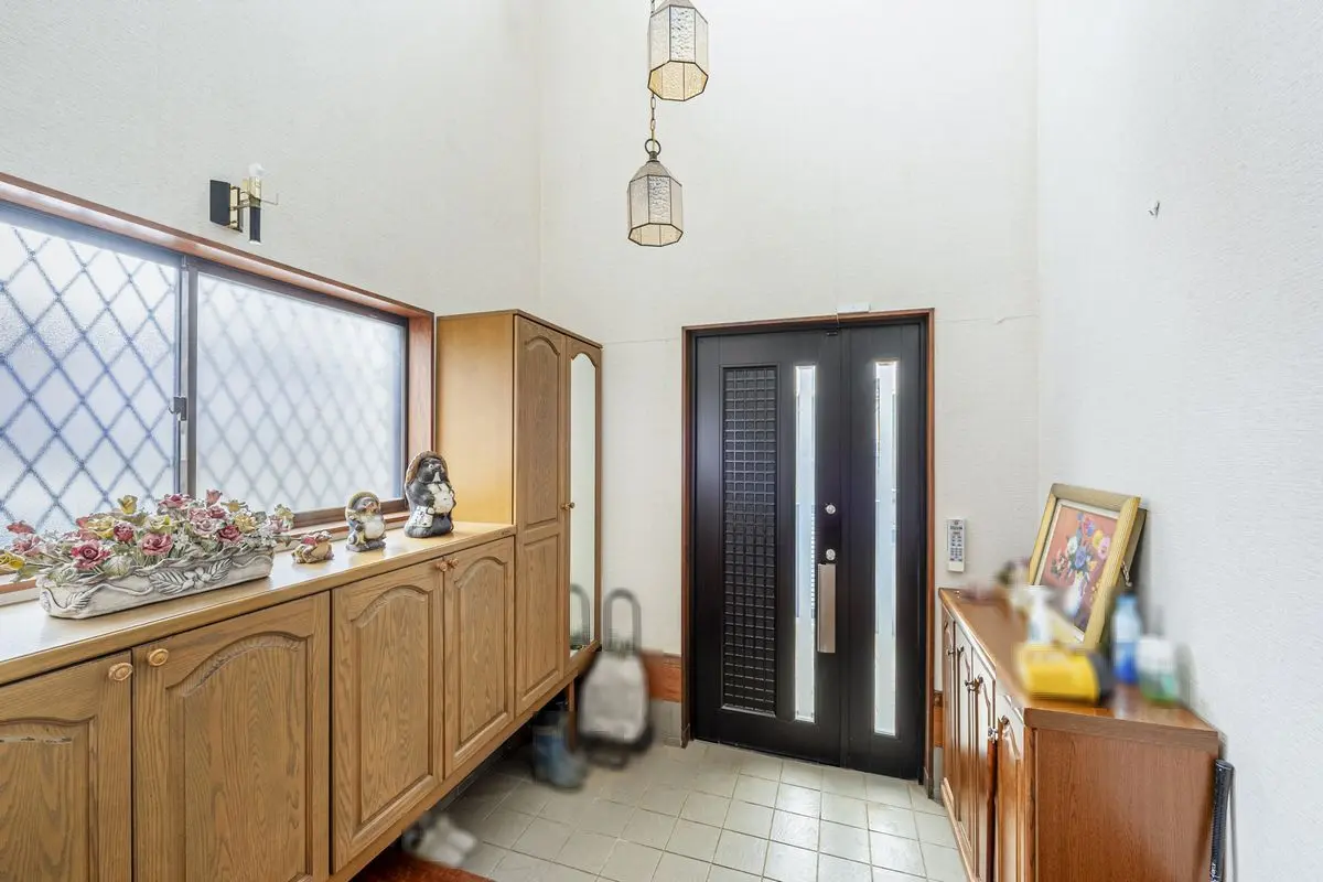 玄関は吹抜になっており、自然光が入り込む明るい空間です。玄関の収納も備わっているため、すっきりとした印象を保てます。ダイニングには備え付けの食器棚があり、日常使いの食器から来客用まで効率よく収納できます。