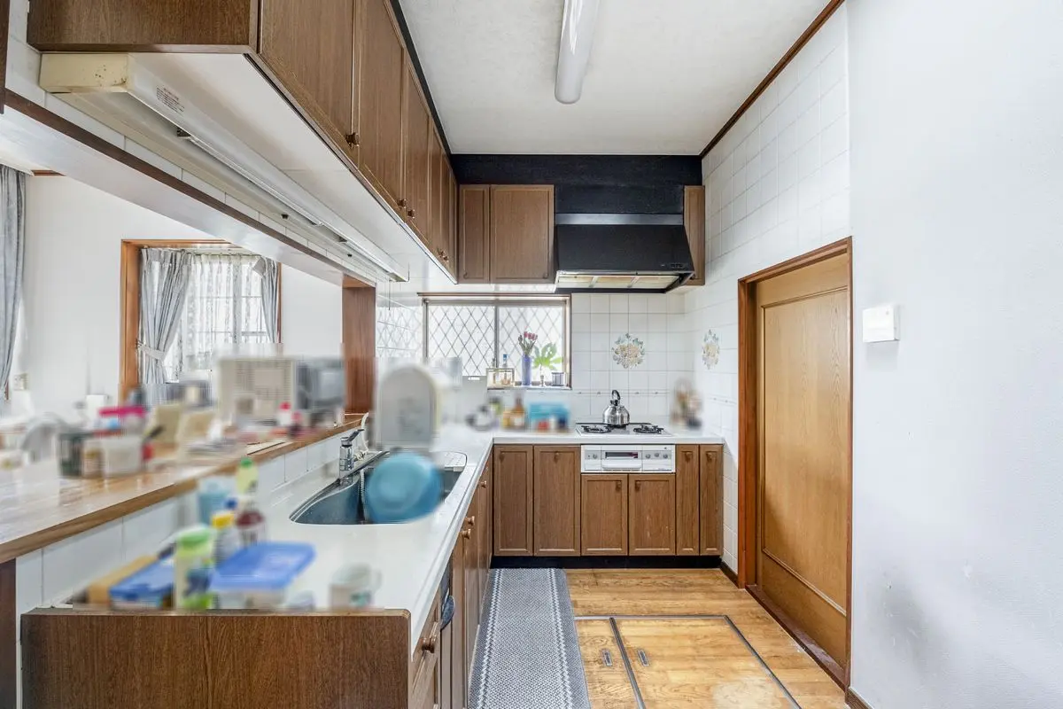 キッチンは、木目調のL字型カウンターキッチンを採用し、上部吊戸棚やシンク・コンロ下の収納、3口ガスコンロなど機能性も充実。ユーティリティを通じて勝手口へとつながり、家事動線がスムーズです。さらに床下収納もあり、ストック品等の管理に便利です。