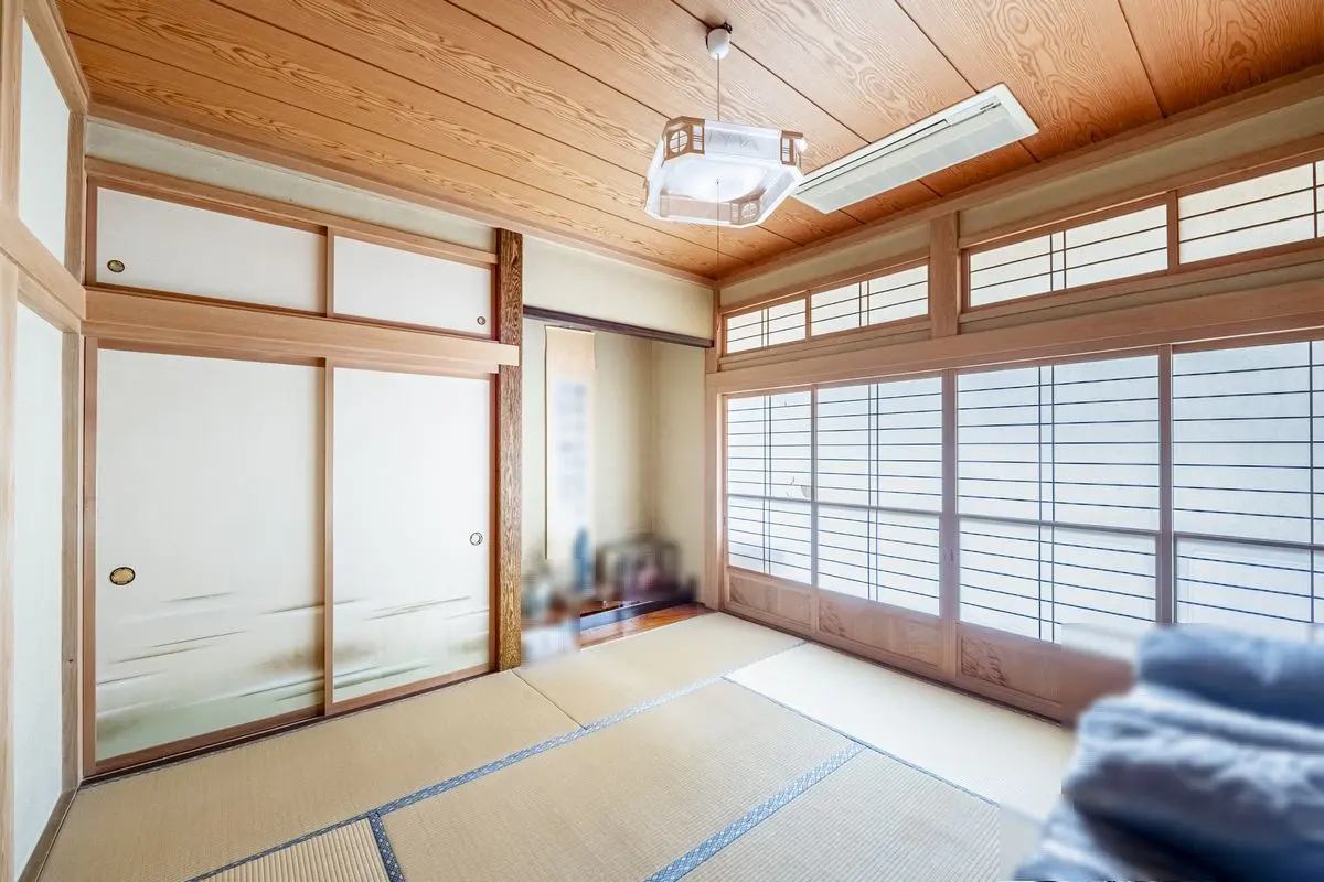 1階の和室(約8.0帖)は、床の間・床柱・長押・天井板といった風格ある落ち着いた空間を形成しています。南側には広縁が広がり、柔らかな光が差し込む和の空間です。