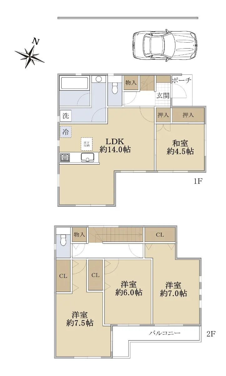 間取は、4LDK、カースペースは車種次第で2台駐車することができます。