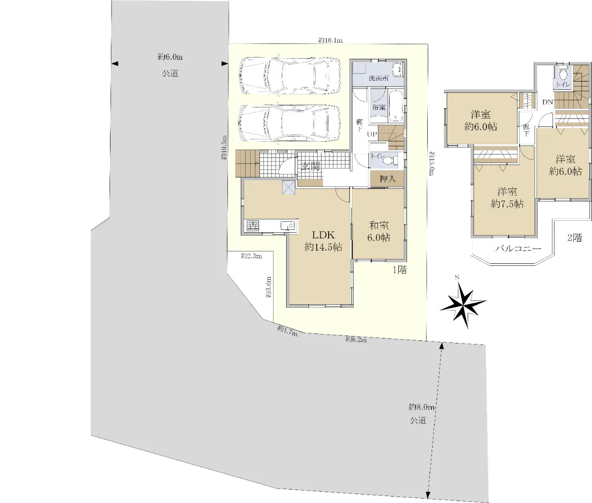 | 接道状況 | 角地・西6m(公道)接面10.5m/南8m(公道)接面7.9m |