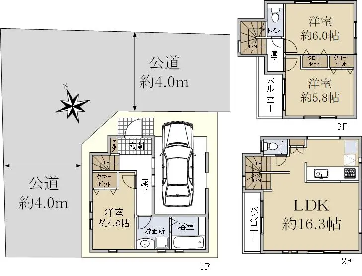 | 接道状況 | 角地・北東4m(公道)接面5.1m/北西4m(公道)接面5.6m |