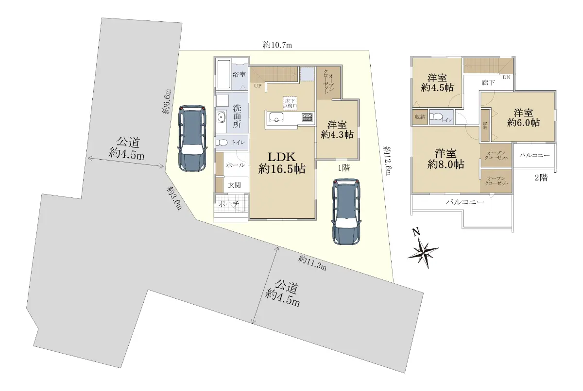 | 接道状況 | 角地・南西4.5m(公道)接面14.3m/北西4.5m(公道)接面6.6m |