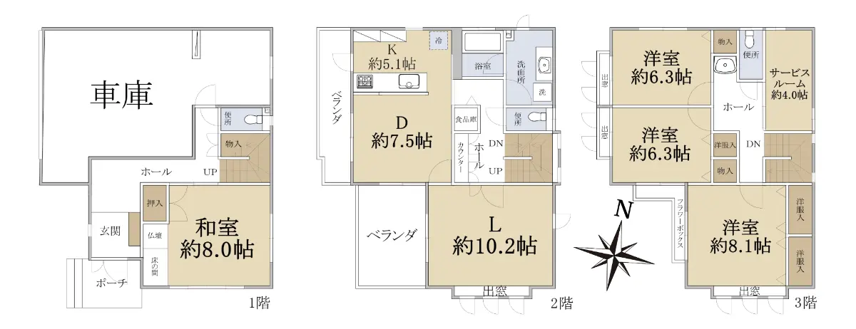 1階に和室約8.0帖、2階にリビング・ダイニング・キッチン、3階が洋室約6.3帖が2部屋、洋室約8.1帖、収納に便利な納戸約4.0帖の間取りです。