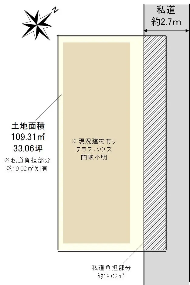 | 土地面積 | 109.31m2(約33.06坪)/他に私道負担:19.02m2あり |